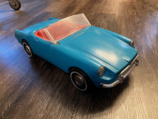 This is “Tammy’s MGB”. Tammy was a fashion doll, Ideal Toy Co.’s competitor to Mattel’s Barbie. Barbie famously drove a Corvette, but apparently Tammy caught the British car bug back in 1962. While this model is not completely accurate in scale, you can see how it is intended to represent a Mark 1 MGB. It even mimics the factory press car — while the blue is much brighter than Iris Blue, it has the red interior, steel wheels and whitewalls. And true to Mk. 1 tradition, the steering wheel is broken in this example — no doubt from trying to cram the stiff-legged doll into the cockpit.